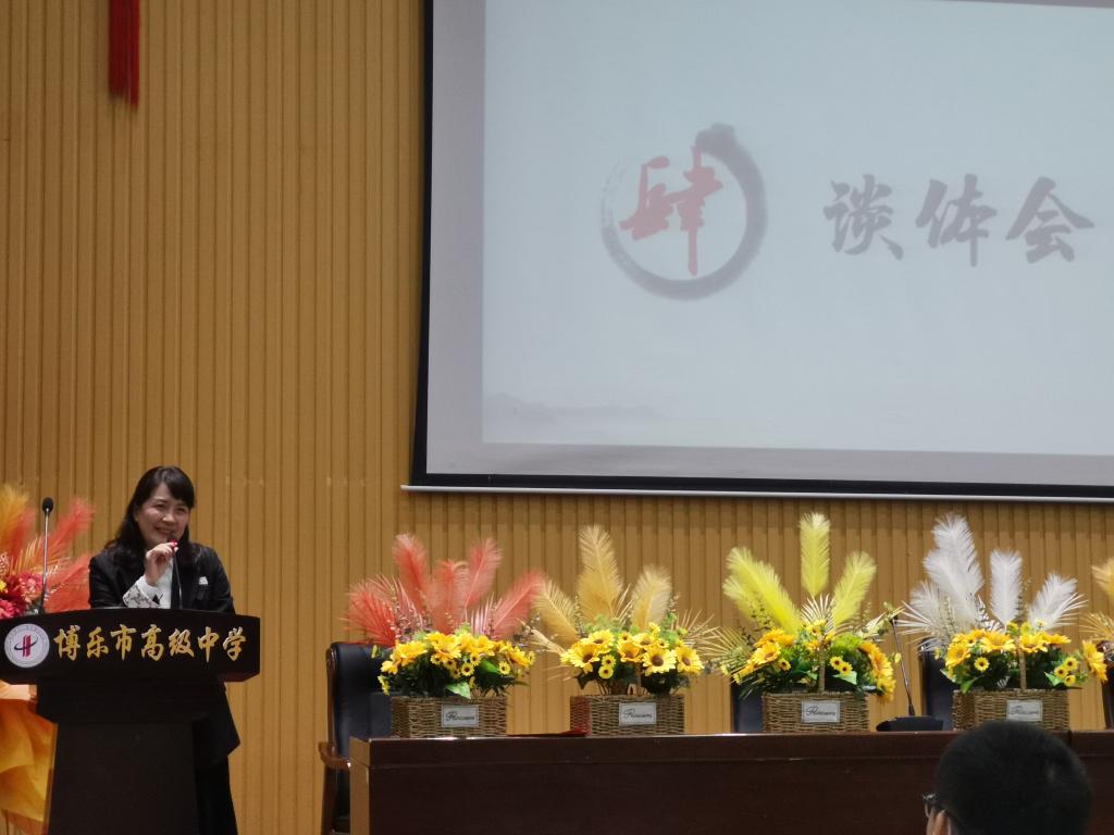 留意身边的故事,平凡之中见真情,细微之处显真爱,用心收获感动,用情传递感激,用行回报感恩。第四个环节“谈感悟”援博教师王惠敏向我们讲述了大半年来援博的经历,她风趣地说“来新疆后她不仅认识了许多新朋友,还接触了许多新事物,学会了新名词,体会了什么是石榴籽似的团结……”