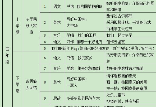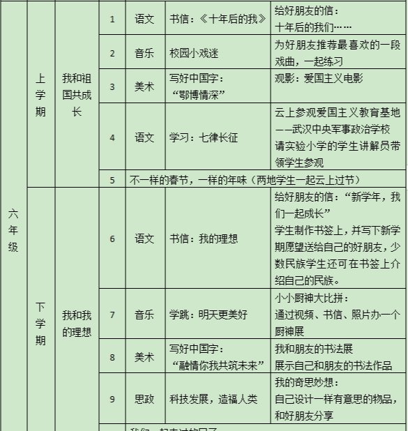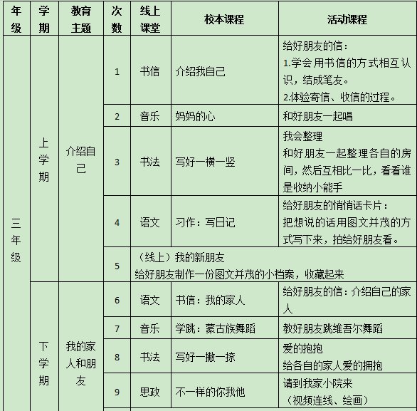 课程活动遵循学生年龄特点,以三年级作为起始结对年段,每个学年从个人交往——民族交流——国家认同——理想信念,逐步开阔视野,深入认知,由浅入深,螺旋上升。