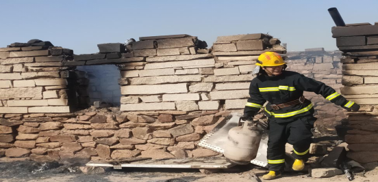 事发现场浓烟滚滚,临时住房的房顶,屋内的地毯、谷物和木材均在着火。专职消防队到场后迅速进行扑救,在控制住火势后队长张松博同志迅速冲入屋内将液化气罐和电瓶拎出并进行降温处理,有效避免了液化气罐和电瓶所造成的二次事故。