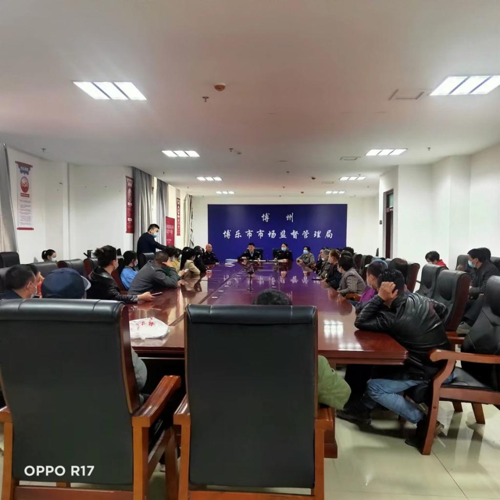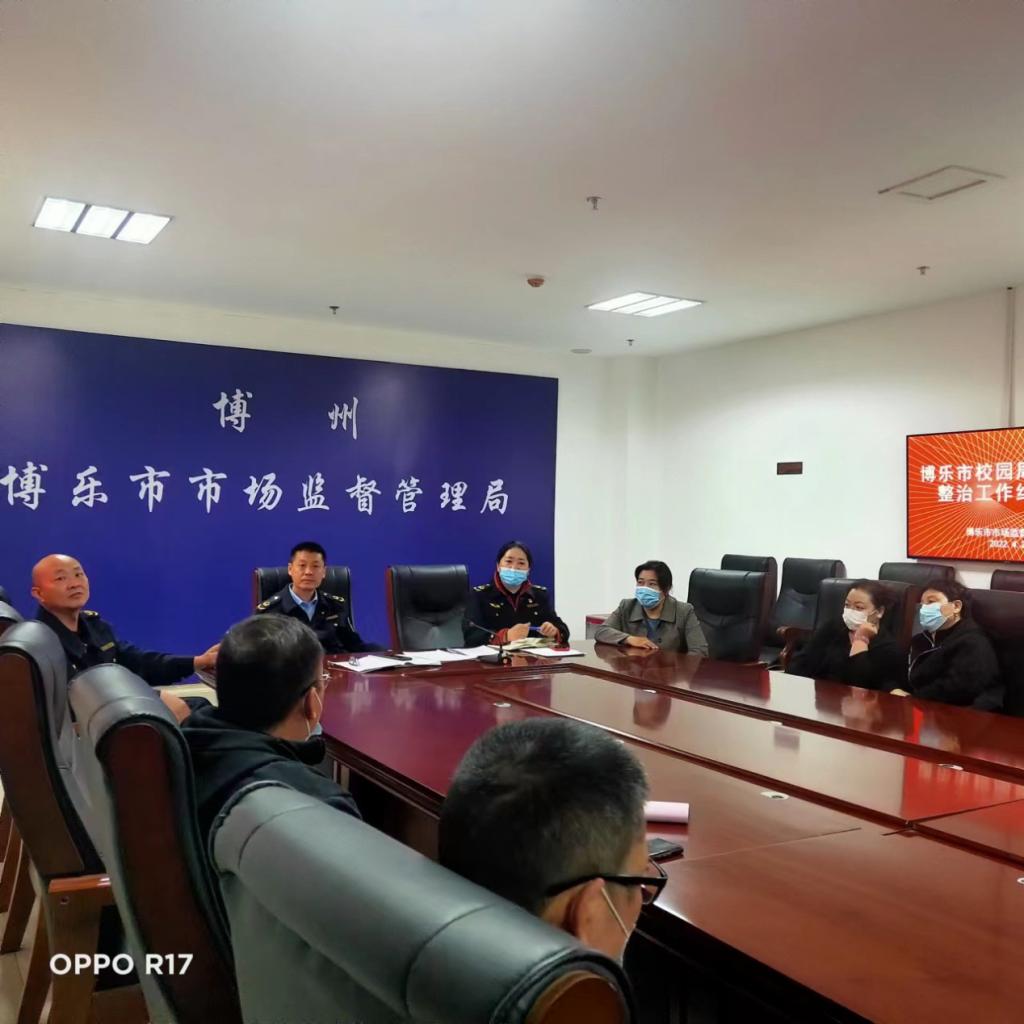 2022年4月25日,博乐市市场监督管理局组织市域校园周边各超市、商店、餐饮负责人在博乐市市场监督管理局二楼会议室召开共同参加净化校园周边环境、共同助力未成年人健康成长为主题的集体约谈会。
