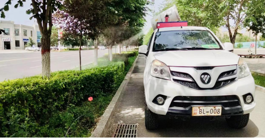 图为:植保站养护人员对东方红大道进行打药防止虫害工作