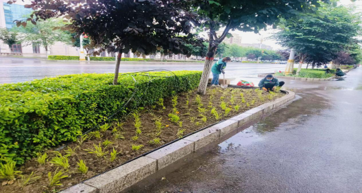 园林绿化服务中心科学组织夏季养护工作,绿化工人栽种花草用新增的绿色生机,诉说着旧疾当愈,万物复苏,增强居民幸福感,绿化工人以辛勤劳动营造花开盛放的优美博乐,营造了更加靓丽的绿色风景。