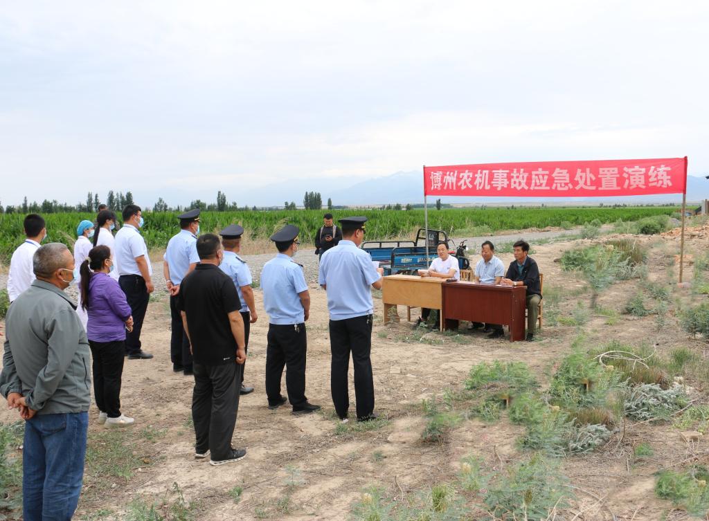 为全面落实农机安全生产责任,进一步提升农机事故应急处置能力,6月24日上午,博州、博乐市农机化发展中心,博乐市农业综合行政执法大队,各乡镇农机监理站、保险公司及部分农机手等联合在小营盘镇托里布拉格西村开展农机事故应急处置演练,共50余人参加此次演练。