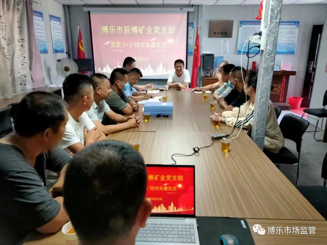 为进一步做好发展党员工作,切实做好入党申请人、入党积极分子帮带培养工作,确保发展党员质量,经博乐市辰博矿业党支部与联系共建单位博乐市市场监督管理局党组协商,确定博乐市市场监督管理局党组派出党员与博乐市辰博矿业党支部入党申请人、入党积极分子结成发展党员“1+1”联系共建对子。