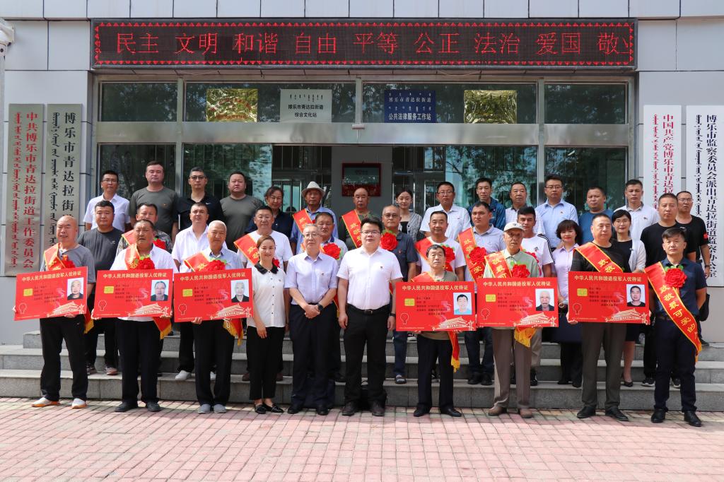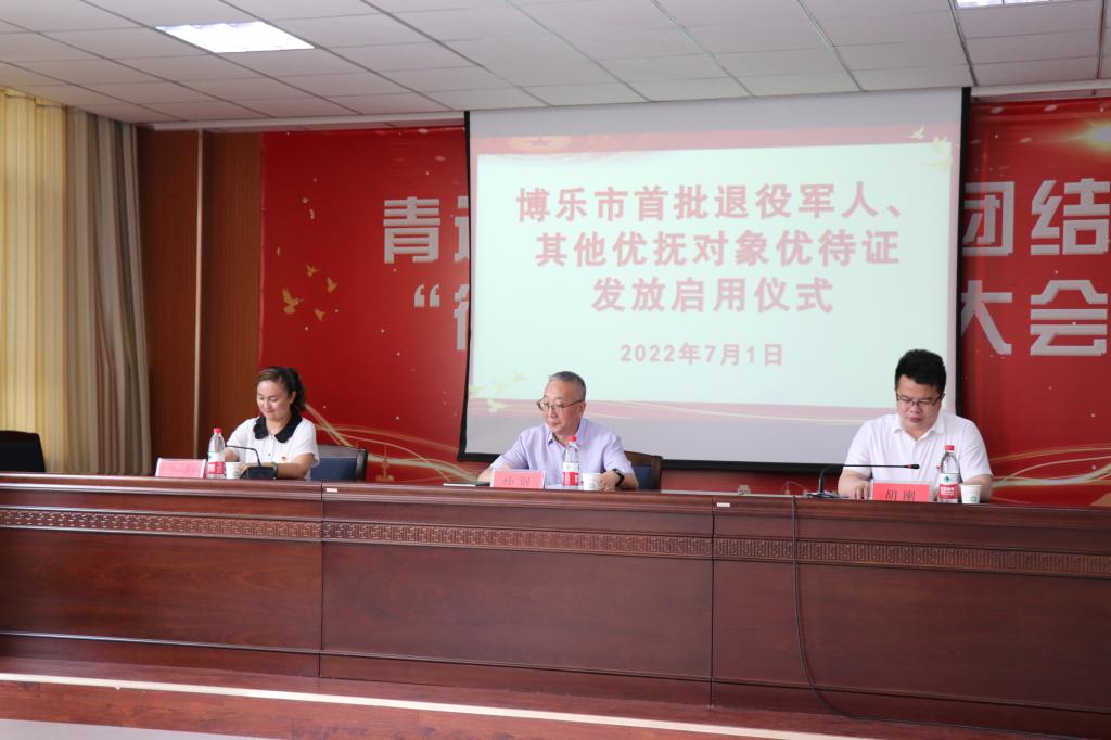 7月1日,博乐市首批举行退役军人、其他优抚对象优待证发放启用仪式,标志着博乐市优待证申领制发工作正式步入颁发使用的崭新阶段。博乐市党委常委胡刚,市退役军人事务局党组书记、副局长古丽拜克热木·阿布力米提,中国工商银行博尔塔拉蒙古自治州分行副行长赵春丽,中国农业银行股份有限公司博乐市支行副行长郑玉,中国邮政储蓄银行股份有限公司博尔塔拉蒙古自治州分行个人金融部总经理赵亮,各乡镇场、街道退役军人服务站站长,部分退役军人及其他优抚对象代表,市退役军人事务局全体人员参加。