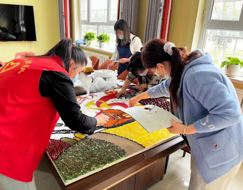 传承粮画艺术,展现巾帼之美。青得里街道社工站关注妇女之需,汇聚巾帼之力,充分发挥女性心灵手巧的能力,展现新时代的巾帼风采。一粒粒特制的各色小种子,利用粮食、菜籽等颗粒的自然形状和颜色,加之“拼、粘、排、画”等工艺,运用勾边、构图、色彩造型手法,被寓为“种在画板上的粮食,挂在墙上的黄金”,这就是“东方粮画”的独特魅力。