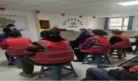 图为:博乐市嘉汇物业公司组织员工学习党的二十大报告内容和物业政策。