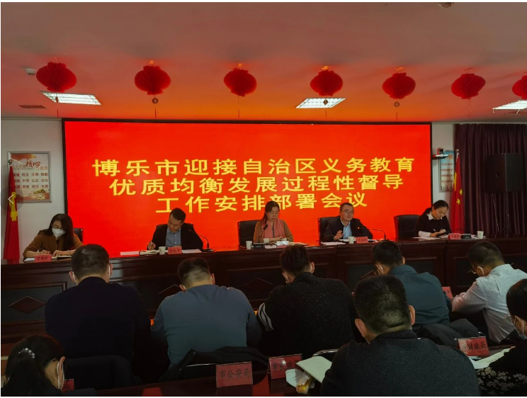 1月30日下午,博乐市组织召开迎接自治区义务教育优质均衡发展过程性督导工作安排部署会,州教育局党组成员、副局长李东梅,州人民政府教育督导室副主任贺晓红,市党委常委、组织部部长、党校校长、教育工委书记凡志彬,全市32个成员单位相关工作分管领导、市教育局班子成员、21所中小学校主要领导及创建指标负责人参加会议。