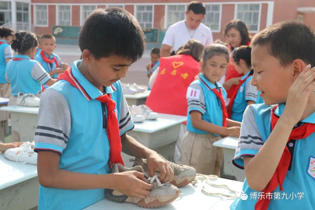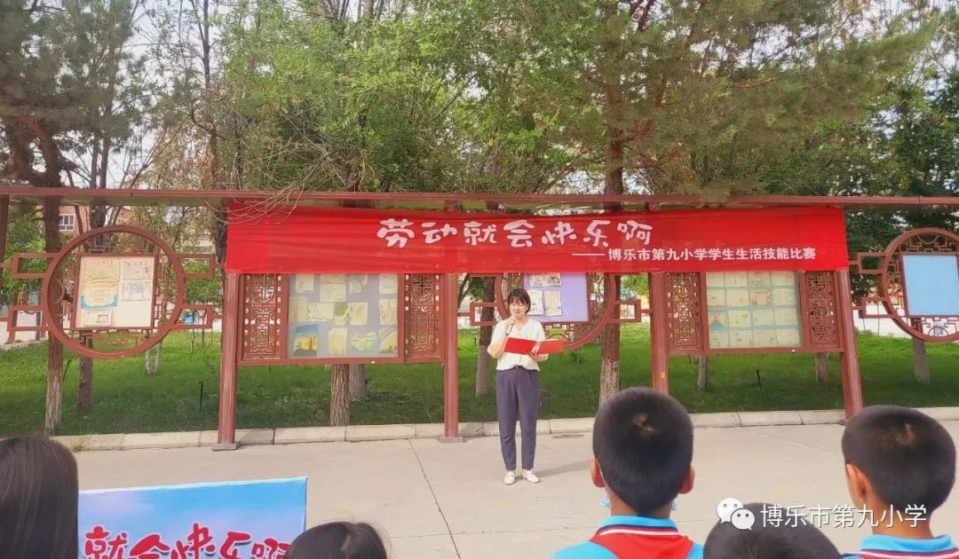 比赛活动开始前,博乐市第一小学一分校(第九小学)党支部书记魏春华带领全体师生学习习近平总书记关于劳动的重要讲话精神,并通过讲故事的形式,将铁人王进喜、掏粪工时传祥、营业员张秉贵、乘务员李素丽、雷锋传人郭明义、好校长张桂梅等劳模形象,植入孩子心中。
