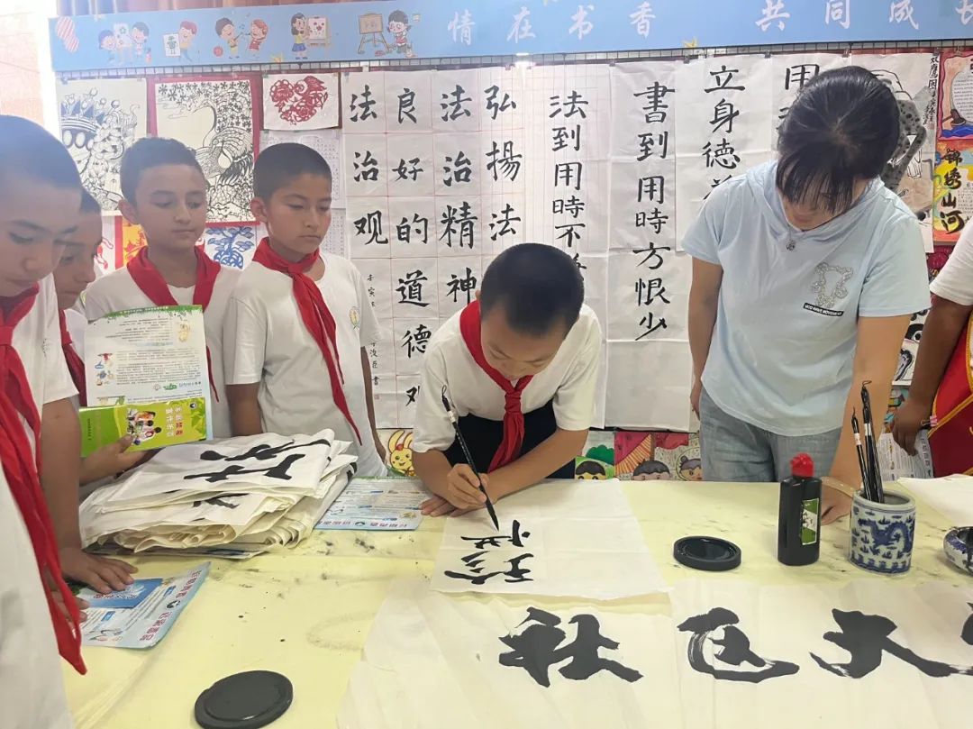 博乐市教育局驻书香社区访惠聚工作队队员吴老师带领孩子们开展"小手拉大手,拒毒共'童'走,共写毛笔字”活动。此次书写活动,让孩子们在欣赏书法艺术美的同时进一步提高了识毒防毒拒毒的意识。