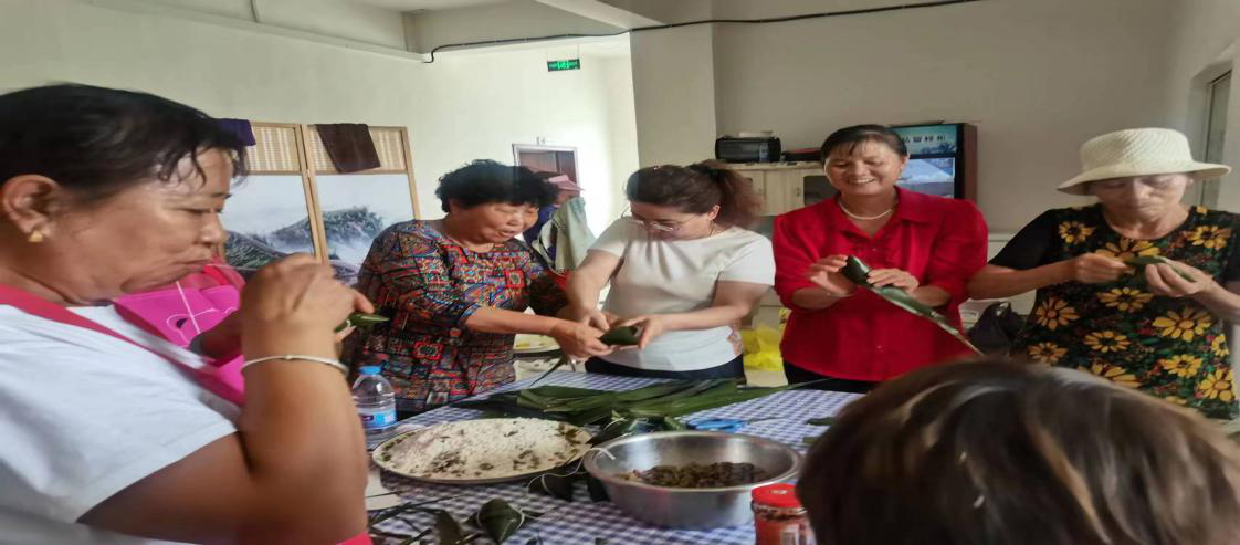 在阿热勒托海牧场阿都呼都格村,村干部及工作队干部提前准备好糯米、粽叶等材料,参加活动人员在村干部的指导下,认真学习包粽子的技法,折叶、填米、扎线等一道道工序有序进行,一个有棱有角的粽子很快诞生。大家一边交流包粽子的技巧,一边拉家常,脸上洋溢着幸福、喜悦的笑容。与此同时,夕阳红舞蹈队、母女双人舞、趣味游戏等活动使大家在其乐融融的氛围中增进了邻里情。
