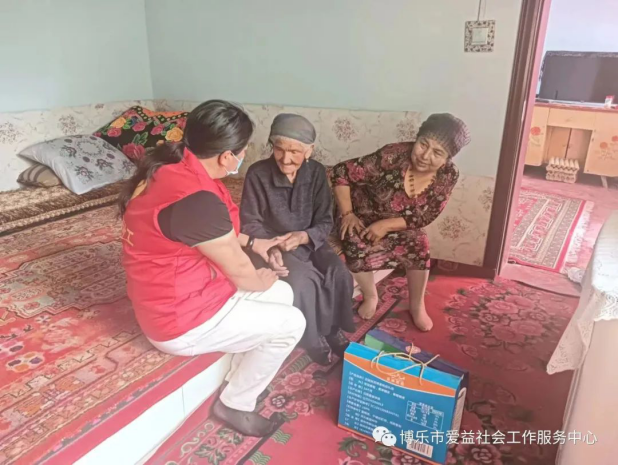 “阿西木汗大妈你好呀,我们来看你啦!”近日,博乐市达勒特镇社工站社工王燕敲响了辖区低保户阿西木汗的家门,为老人送上了牛奶、营养粥等慰问品。