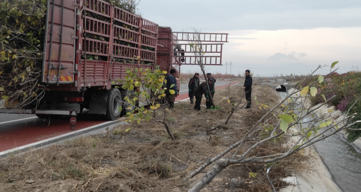 博乐市海棠生态园工作人员运苗入坑