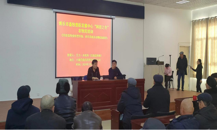 2月26日,博乐市林业和草原局和博乐市畜牧兽医发展中心在小营盘镇青得里浩特乎尔村举办了冬季农牧民培训,为了做好草原畜牧业转型工作,相关单位的工作人员到现场给农牧民讲解了畜牧业品种改良防疫、草原转型等方面内容。
