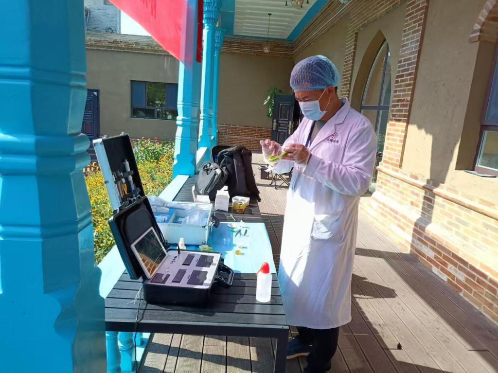 随后,根据征集情况,执法人员和抽样人员在景区内随机抽取了农家乐的烤肉、西瓜、包尔萨克、煎炸过程用油、辣椒5个批次的样品,由检测机构工作人员现场进行快速检测。