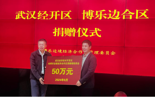 座谈会上双方进行了亲切友好的交流,陈明骏主任代表武汉经济技术开发区向博乐边境经济合作区捐赠了50万元对口援助资金。