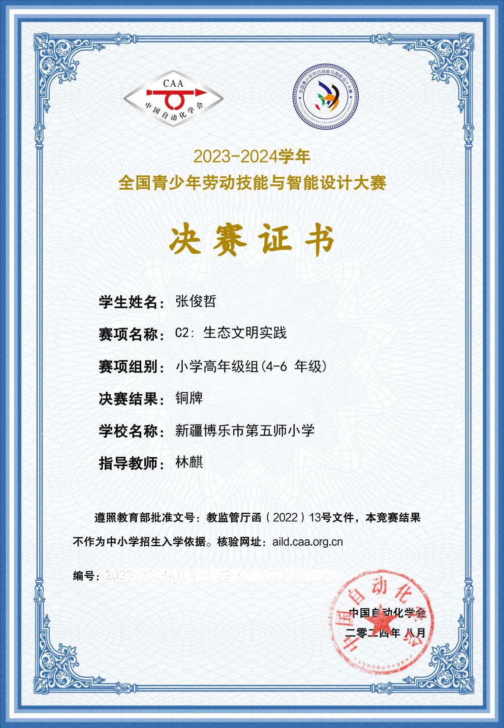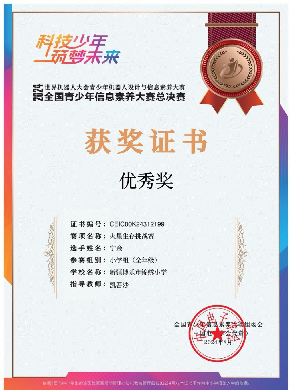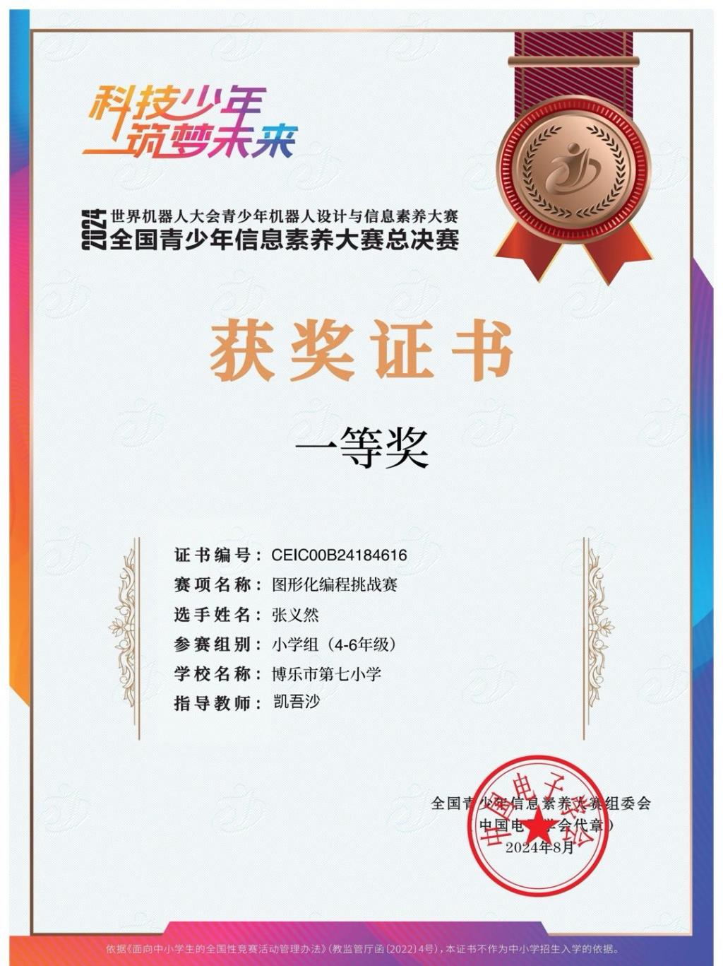 在近期结束的2024全国青少年信息素养大赛总决赛,博乐市科技类校外培训机构辅导培训的两名选手从22万名参赛选手中脱颖而出,分别获国赛一等奖和国赛优秀奖,其中:博乐市第七小学(锦绣一分校)张义然同学获得图形化编程挑战赛全国总决赛一等奖,博乐市锦绣小学宁金同学获得火星生存挑战赛全国总决赛优秀奖。