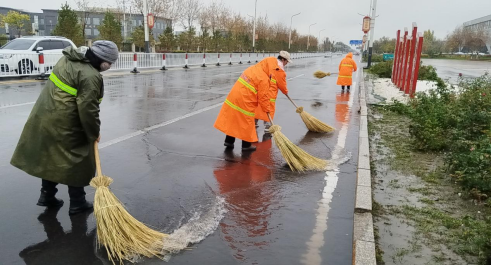 博乐市市容环境卫生服务中心加大对主次干道地毯式排查力度,出动300余人对路面因雨水冲刷而掉落的树叶、漂浮物等杂物进行清扫、捡拾,避免堵塞道路水箅子、排水口。同时根据雨势变化,及时组织环卫工人对道路及排水口开展积水清扫、淤泥清理、排水等深度保洁工作,确保路面“时时干净、处处干净”。
