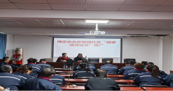 为积极响应国家推广普及国家通用语言的号召,提升社区居民语言文化素养。2024年11月29日,博乐边合区鄂博社区文明实践站组织五台工业园区上峰水泥企业职工开展了“文明实践大家一起行动”质量提升月推广国家通用语言活动。