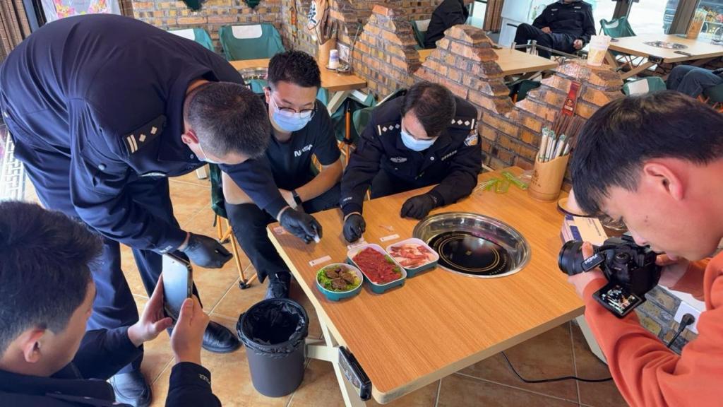 检查中,联合执法人员对火锅店进行了重点排查,现场检查经销商票证等手续是否齐全、详细核查肉制品进货来源、肉制品是否经检验检疫、检验检疫不合格的核对近期销售记录情况等。同时对售卖的肉制品进行现场快速检测,经检测未发现鹅鸭源。