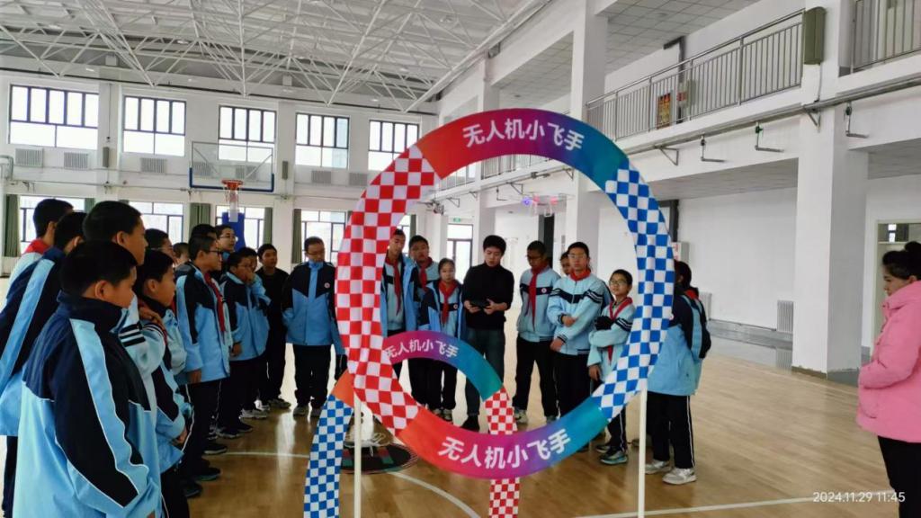 活动伊始,专业的无人机老师们带着各式各样的无人机闪亮登场。在博乐市第九中学的体育馆,同学们十分好奇,他们的目光紧紧跟随着无人机老师手中的遥控器。随着一阵轻快的嗡嗡声,无人机腾空而起,时而盘旋高飞,时而低空掠过,灵活地做出各种精彩动作,引得孩子们阵阵惊叹与欢呼。无人机老师们还通过生动有趣的讲解,向同学们普及了无人机的发展历程、基本构造、飞行原理,从航空拍摄、农业植保到应急救援等无人机广泛的应用领域,让学生们直观领略到前沿科技的魅力,更激发了其对科学技术的浓厚兴趣与探索欲望,在他们心中种下科技创新的种子,有助于培养未来具备科学素养和创新能力的综合性人才,为科技事业的持续发展储备后续力量。