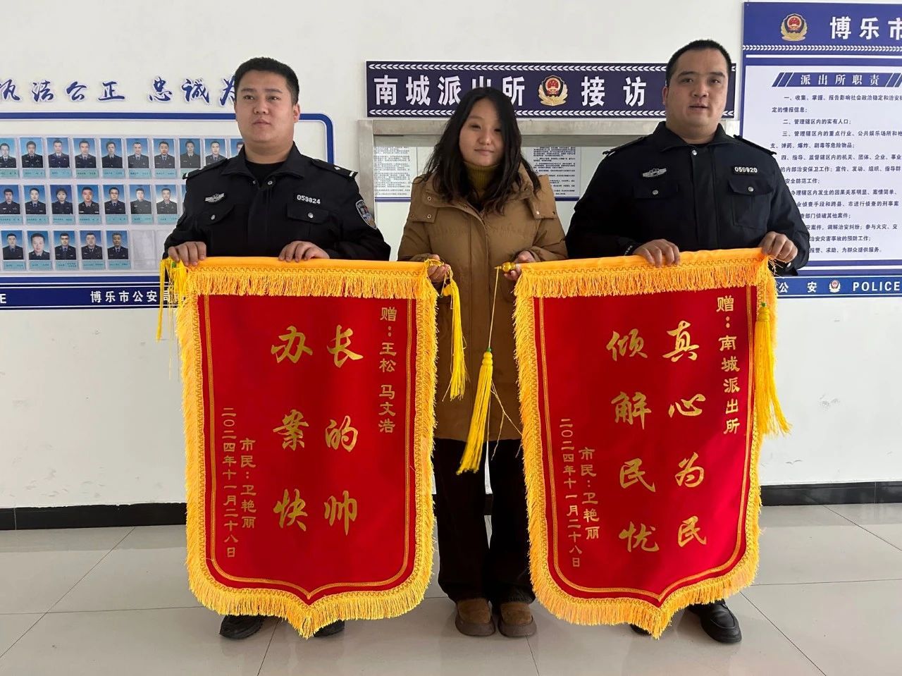两面锦旗,诉说着警民之间的鱼水情深。12月4日,博乐市公安局南城派出所收到一位群众赠送的两面分别写着“真心为民,倾解民忧”、“长的帅,办案快”的锦旗,锦旗上的一字一句都承载着这位群众对公安基层派出所工作的认可和支持。