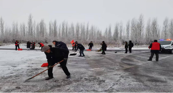 近日,受天气影响,博乐边境经济合作区五台片区部分道路及路口出现大量结冰,给企业出行人员造成较大的交通安全隐患。为保障辖区道路畅通和企业人员安全出行,五台片区安环办迅速组织一切力量,积极开展道路结冰清除工作。