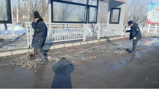 他们身穿厚实的防寒服,手持铁锹等工具,仔细地铲除路面上的冰层和积雪。尤其针对公交站台,这里是每日出行的必经场所。为保障五台片区内人员候车和上下车的安全,除冰工作小组不畏严寒,一锹一锹地将冰块敲碎、铲起,及时进行除冰工作。