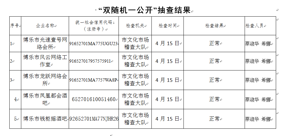 按照随机抽取结果,我局共有文化经营单位83家,按3%的比例目前已抽查企业5家,其中正常企业5家随机抽查结果公示如下:
