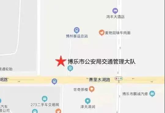 博乐市公安局交通管理大队新地址为:博乐市赛里木湖路老州客运站(鸿丰大酒店正对面)(南城恒大汽车城北门斜对面)。