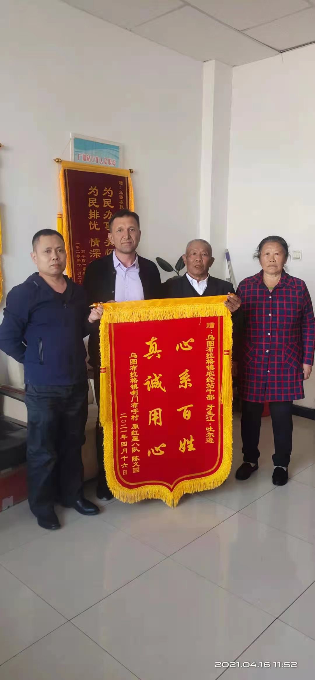 4月16日上午,乌图布拉格镇站所楼里显得格外热闹,乌图布拉格镇喇门布呼村村民陈义国笑容满面地将写有“心系百姓 真诚用心”的锦旗送到了乌镇农村合作经济发展中心干部牙生江·吐尔逊手中,以此表达感谢。