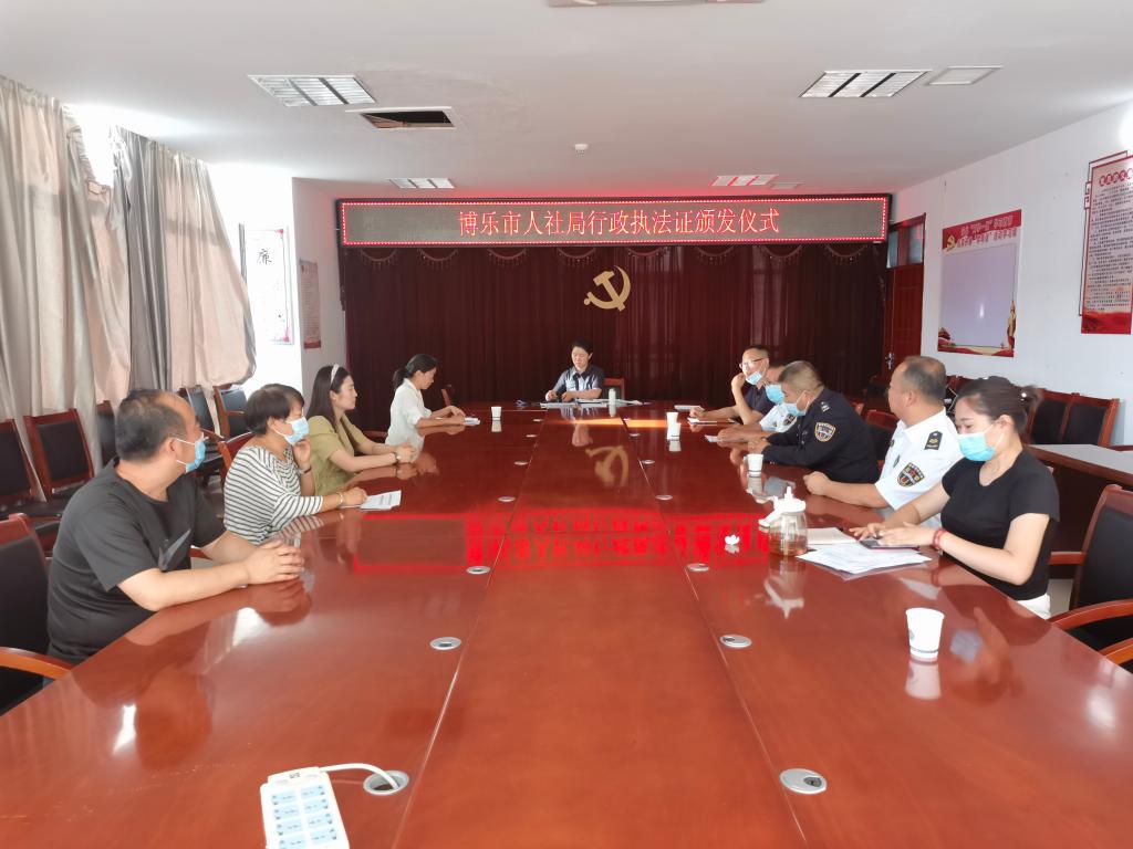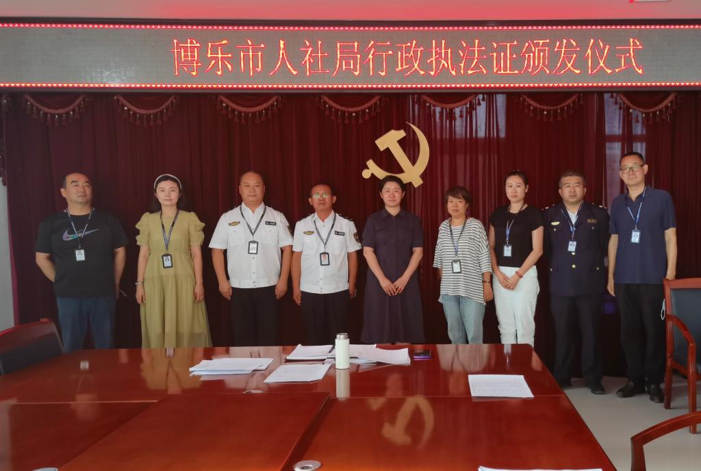 为进一步做好劳动保障领域行政执法工作,增强行政执法人员的责任感、使命感和荣誉感,博乐市人社局于7月21日举行新版行政执法证颁发仪式,局机关及社保中心全体干部职工参加此次活动。