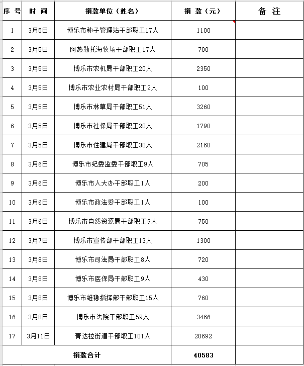 自新冠病毒肺炎疫情发生以来,博乐市社会各界积极支持疫情防控工作。在此,博乐市红十字会对社会各界的爱心善举表示衷心的感谢!截止3月12日接受捐款40583元,具体情况公示如下: