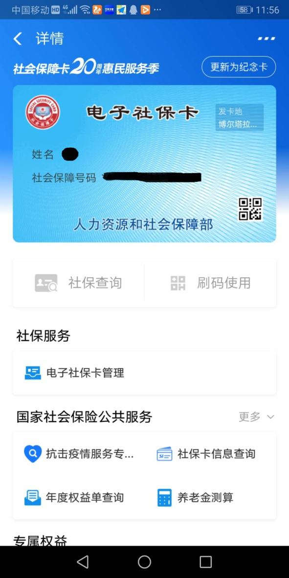 使用电子社保卡时,可在支付宝“卡包”(或在“城市服务”中,选择“电子社保卡”),展现电子社保卡(见上图右)。