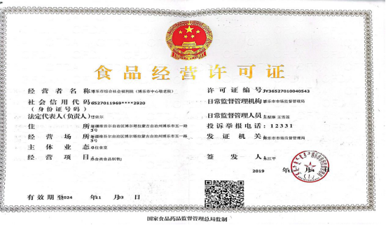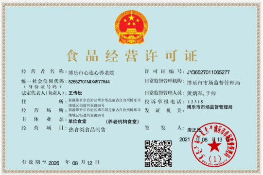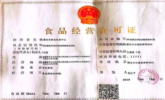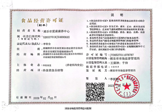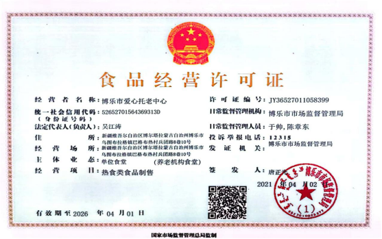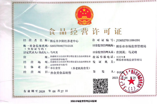 博乐市夕阳红养老中心(达勒特镇幸福大院)食品经营许可证