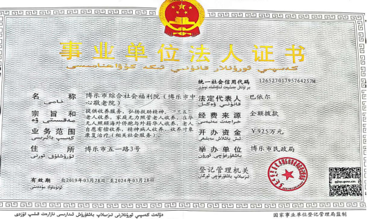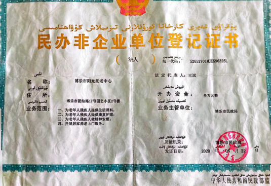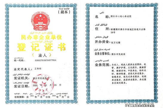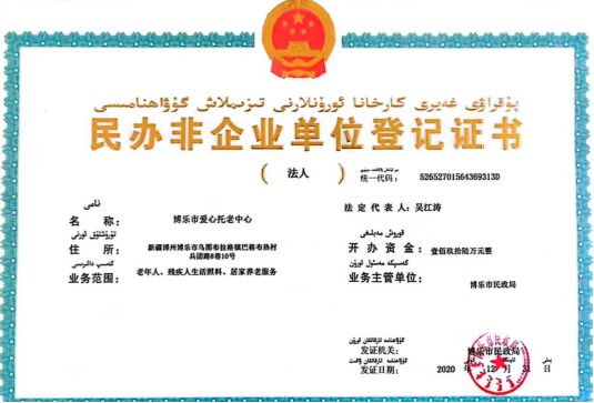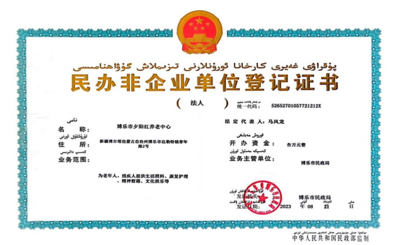 博乐市夕阳红养老中心(达勒特镇幸福大院)民办非企业单位登记证书