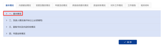 1.基本情况;2.内部建设情况;3.变更及整改情况;4.年度活动情况;5.承接政府委托情况;6.资金财务情况;7.对外工作情况;8.工作报告;9.相关材料。