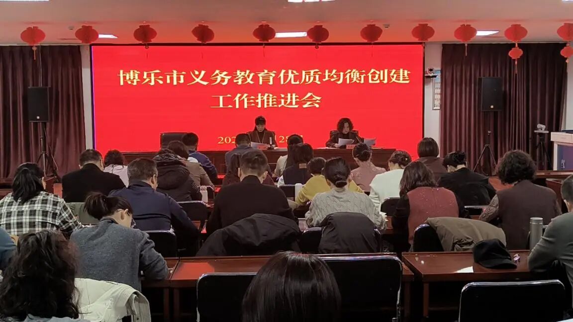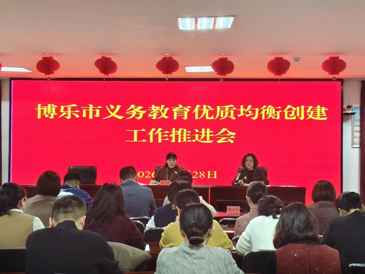 为全面推进义务教育优质均衡发展创建工作,压实创建责任,破解发展瓶颈,1月28日上午,博乐市教育局组织召开2026年义务教育优质均衡创建工作推进会,以“提质增效、达标冲刺”为核心目标,动员全市教育系统凝聚共识、精准发力,推动创建工作向纵深突破。市教育局领导班子成员、创建指标组负责人、全市义务教育阶段中小学校党组织书记、责任督学、教研员等参加会议,实现创建工作核心力量全覆盖。