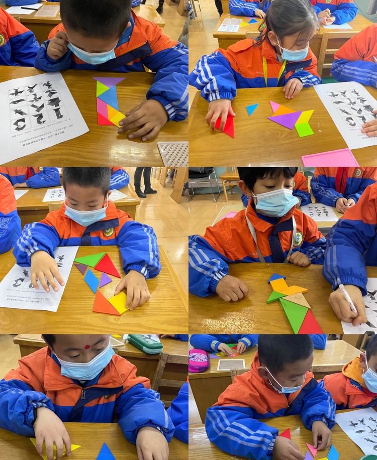 有的同学紧皱眉头静静思考,有的同学冷静沉着应战,还有的同学因为完成一幅图而眉飞色舞。孩子们进入了紧张的比赛状态,一个个小脑袋不时的来回移动着,一双双小眼睛不停地左右转动着,紧张而兴奋,快速而有序。一块块五颜六色的七巧板穿梭于孩子们小巧的手指间。不一会功夫,就拼出了一幅幅多姿多彩的传神作品。