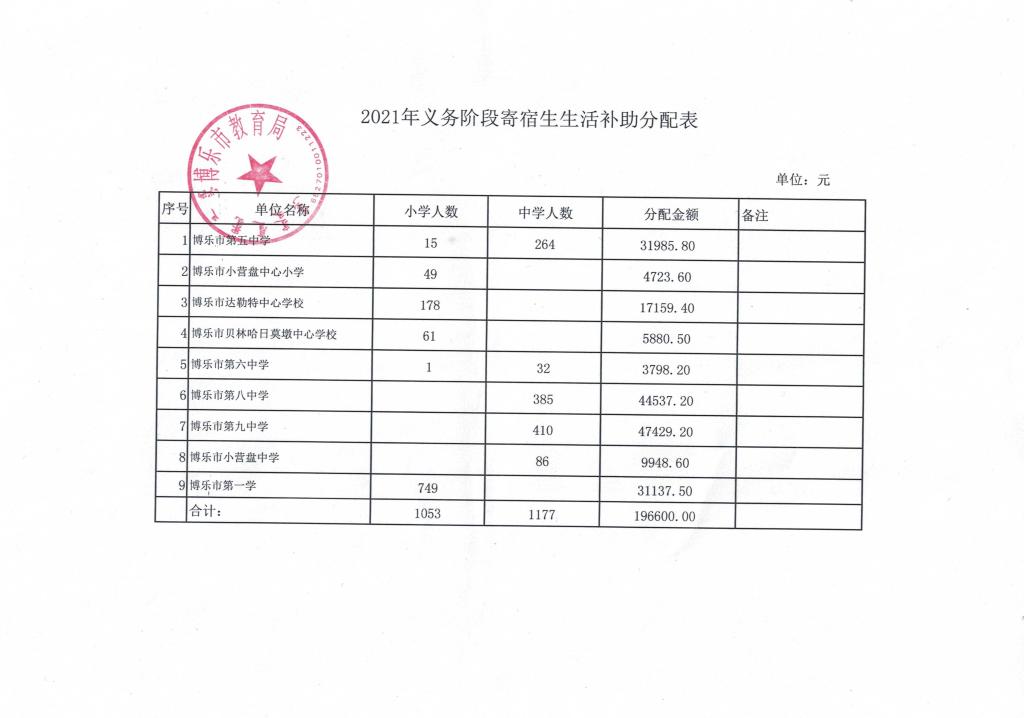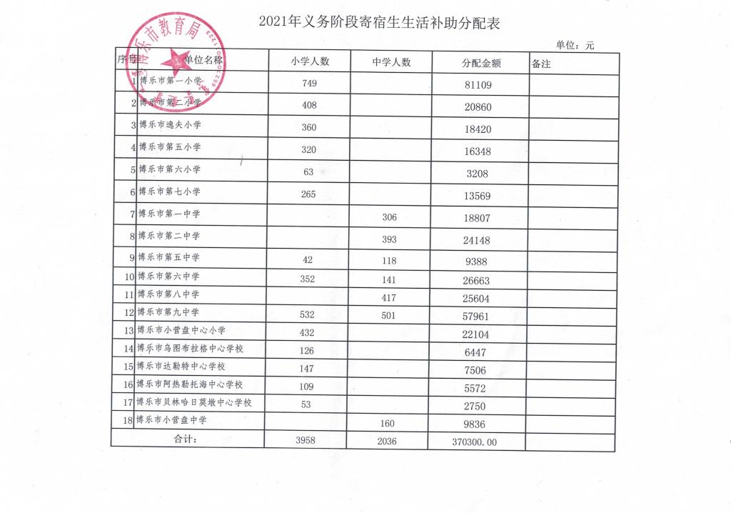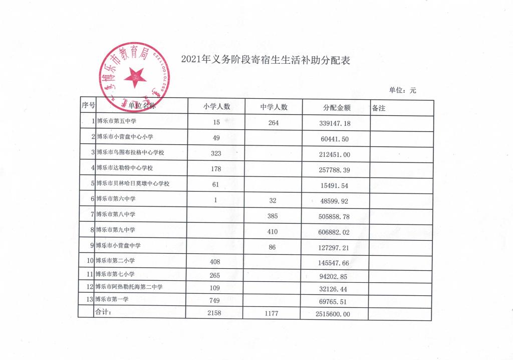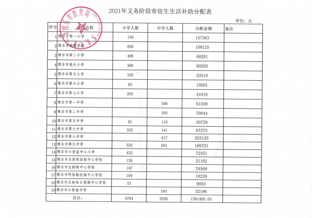 根据博乐市教育局《关于调整寄宿生生活补助经费的函》,调整后寄宿生生活补助经费分配方案如下: