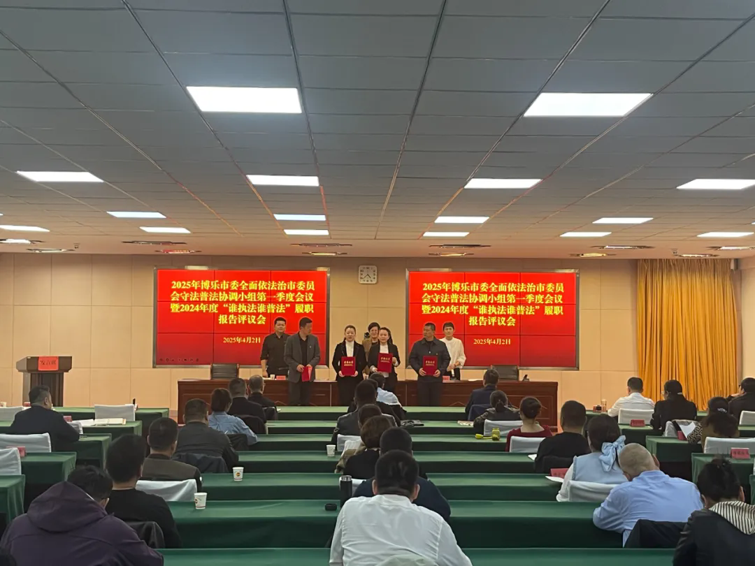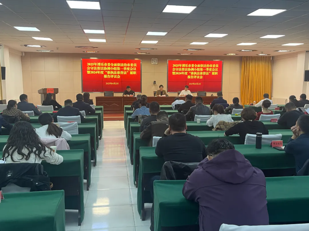 2025年4月2日下午,博乐市委全面依法治市委员会守法普法协调小组会议暨“谁执法谁普法”履职报告评议会议在市直8号楼4楼会议室顺利召开。全市63家单位主要领导、分管领导同志参加。