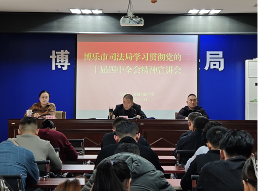 按照市委统一安排,2025年12月15日,博乐市司法局开展党的二十届四中全会精神专题宣讲,市司法局党组书记董奕同志围绕党的二十届四中全会精神,为全局干部职工进行了专题宣讲。律师事务所、公证处负责人及代表一同参加了学习。
