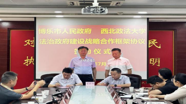 最后,博乐市人民政府副市长、公安局局长阙兴华,西北政法大学党委委员、副校长孙昊亮分别代表双方在协议上签字。双方按照“优势互补、相互支持、长期合作、共同发展”的合作原则,重点在能力素质提升、体制机制建设、优化提升法治化营商环境、数字化法治政府建设、人才队伍培养等方面开展深入合作,推动校地人才共享共育共赢。