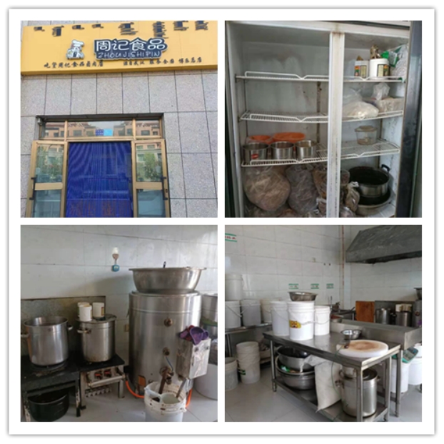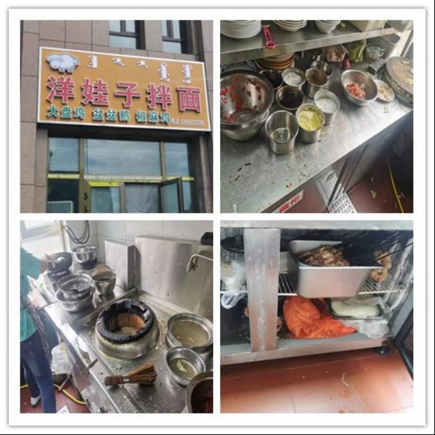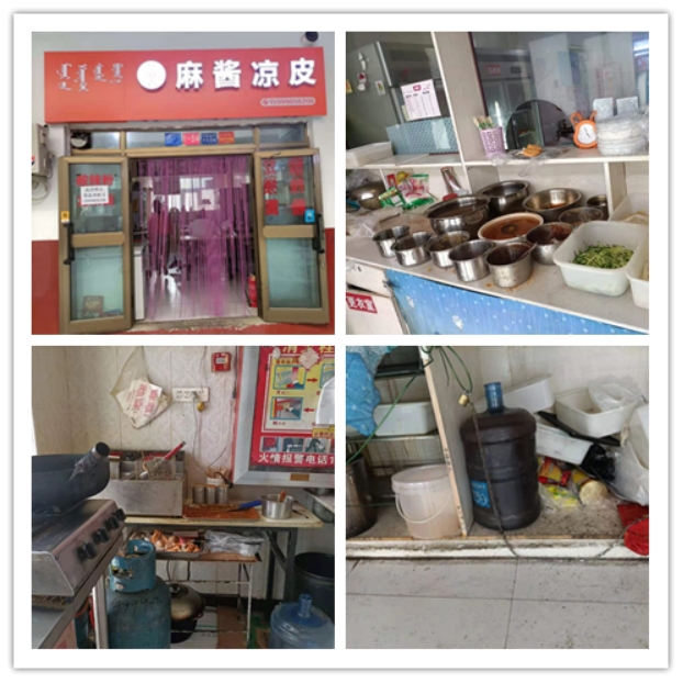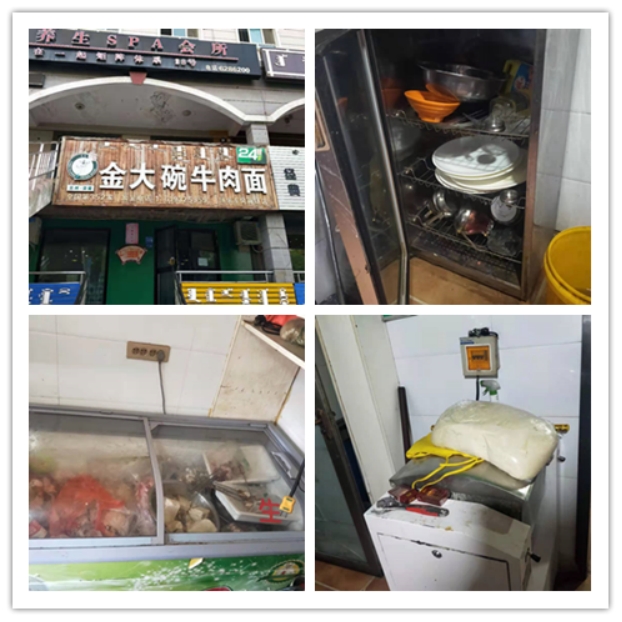 上榜原因:1、消毒柜摆放杂乱、未使用;2、冷冻食品未分类储存;3、后堂卫生脏乱差;4、未取得凉菜经营许可证,超范围经营。