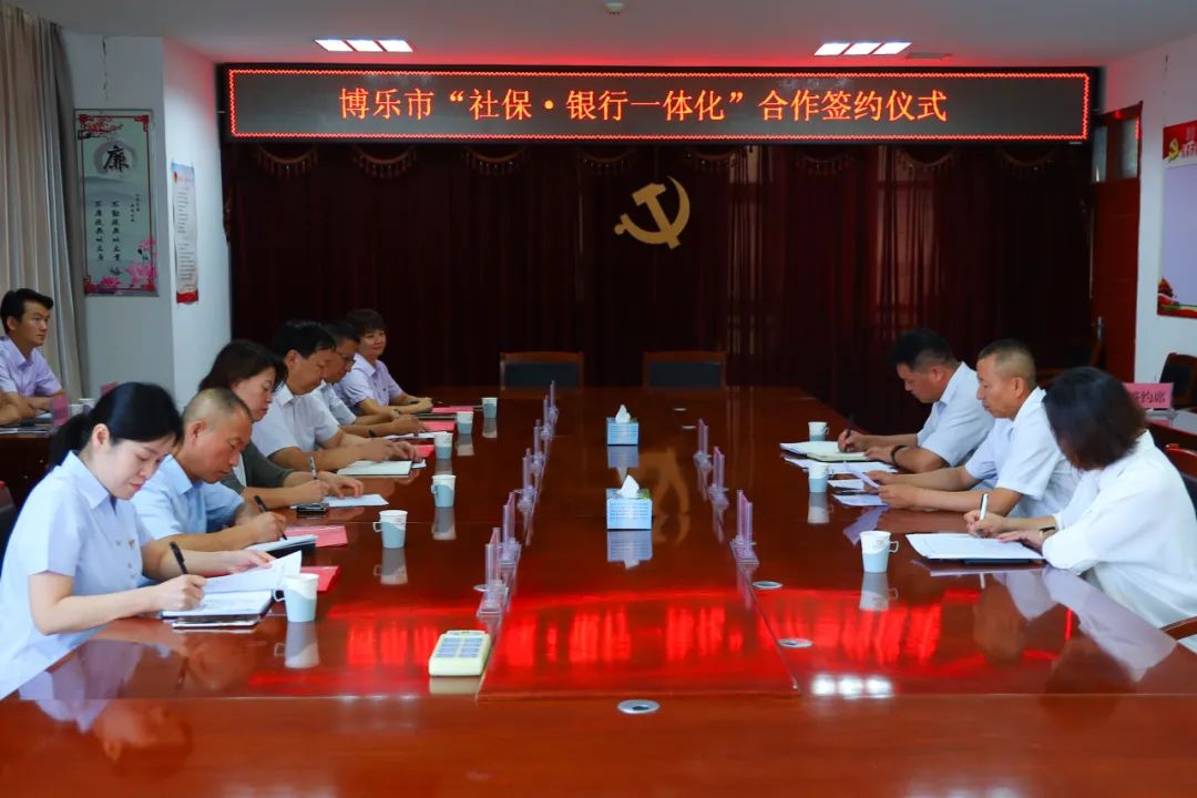 博乐市社会保险中心与市区银行举行“社银一体化”合作签约仪式。