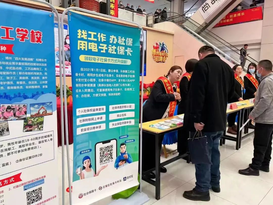 博乐市社会保险中心工作人员在博州就业招聘会上向求职者宣传社保政策。