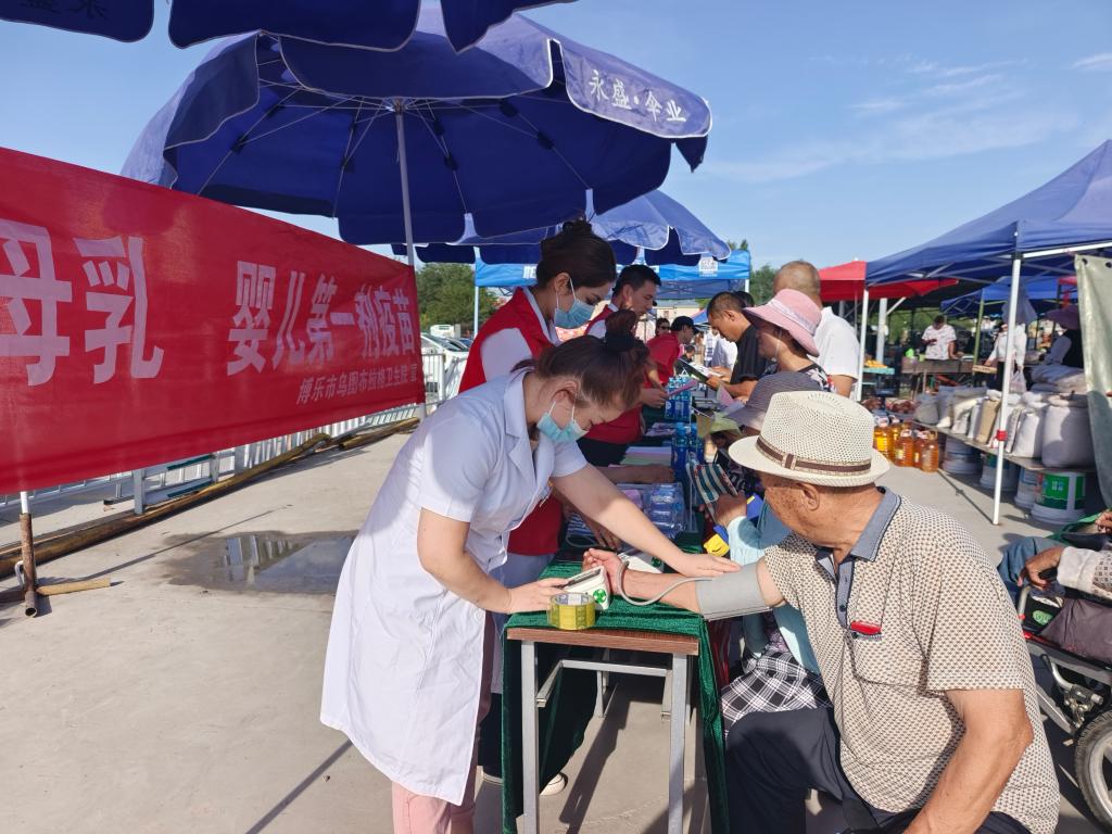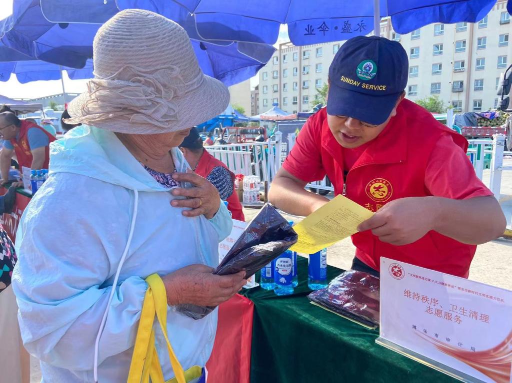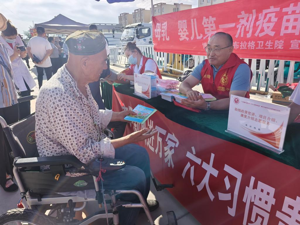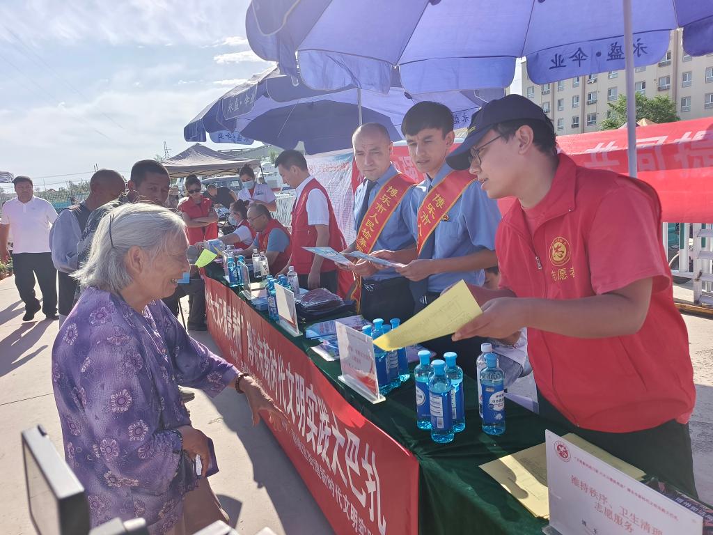 活动现场,博州残联的志愿者们耐心的为前来咨询的残疾人讲解助残政策,康复介绍、博州司法局的志愿者们热情的为群众宣传防电信诈骗及铁路安全知识、博州服务大厅的志愿者们为群众讲解医疗保险政策、市检察院的志愿者们开展法律宣传、博乐市审计局志愿者忙前跑后协助维持现场秩序、乌图布拉格卫生院健康义诊志愿服务队认真地为赶集群众测量血压、听诊把脉,对患高血压、一对一进行健康指导,详细耐心地解答居民的疑问。