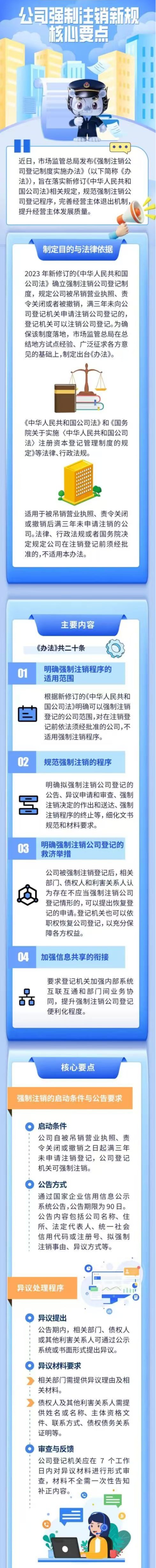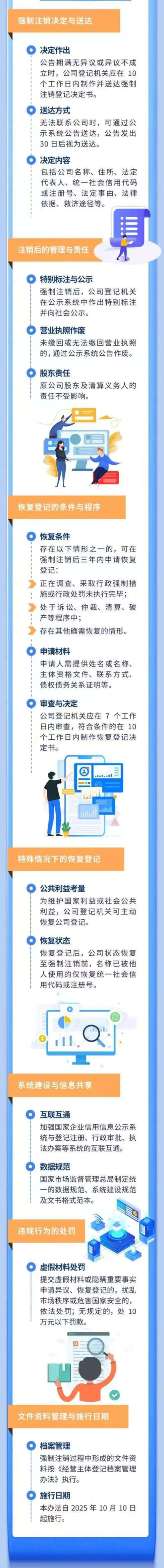 近日,市场监管总局制定出台《强制注销公司登记制度实施办法》(以下简称《办法》),规范强制注销公司登记程序,完善经营主体退出机制,提升经营主体发展质量。《办法》将于2025年10月10日起正式施行。