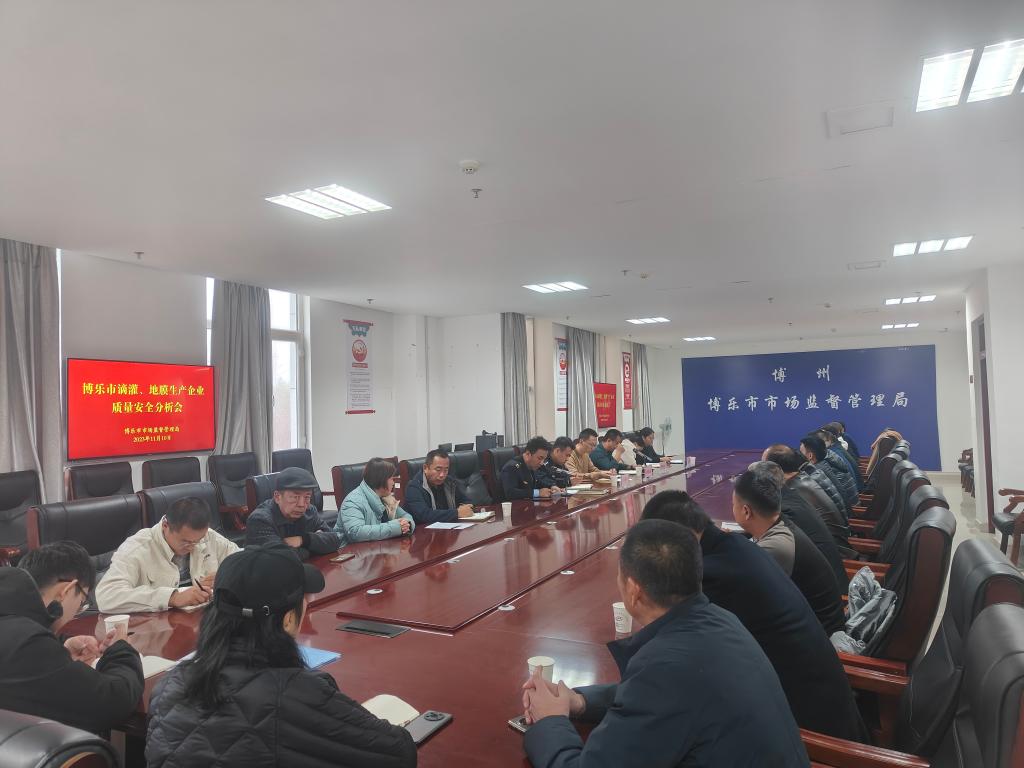 为规范博乐市滴灌带和农用地膜生产企业落实主体责任,促进行业自律,实现守法、依规、诚信生产经营,促进滴灌带、农用地膜生产企业健康稳定发展。11月10日博乐市市场监督管理局联合自治州产品质量检验所、博乐市农业农村局、博乐市公安局召开博乐市农用地膜、滴灌带生产企业质量安全分析会。博乐市农用地膜、滴灌带生产企业负责人共30余人参加会议。