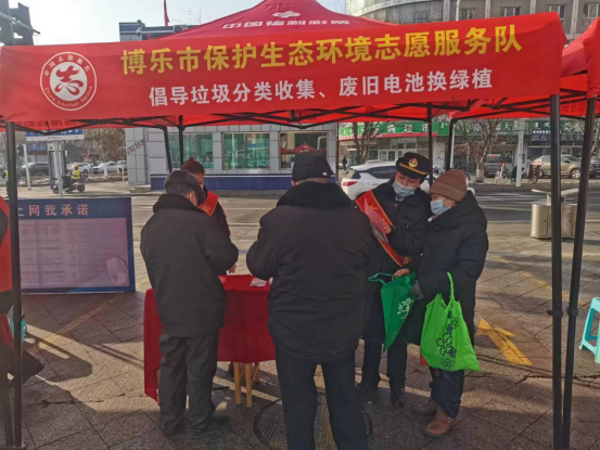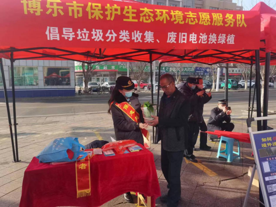 2023年3月4日上午,在新友好购物中心门前广场,博州生态环境局博乐市分局志愿服务队开展“倡导垃圾分类收集、废旧电池换绿植”志愿服务活动。